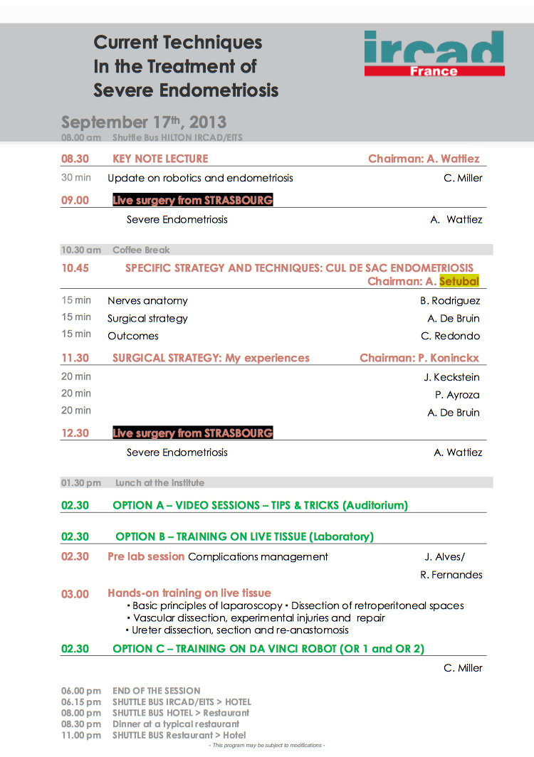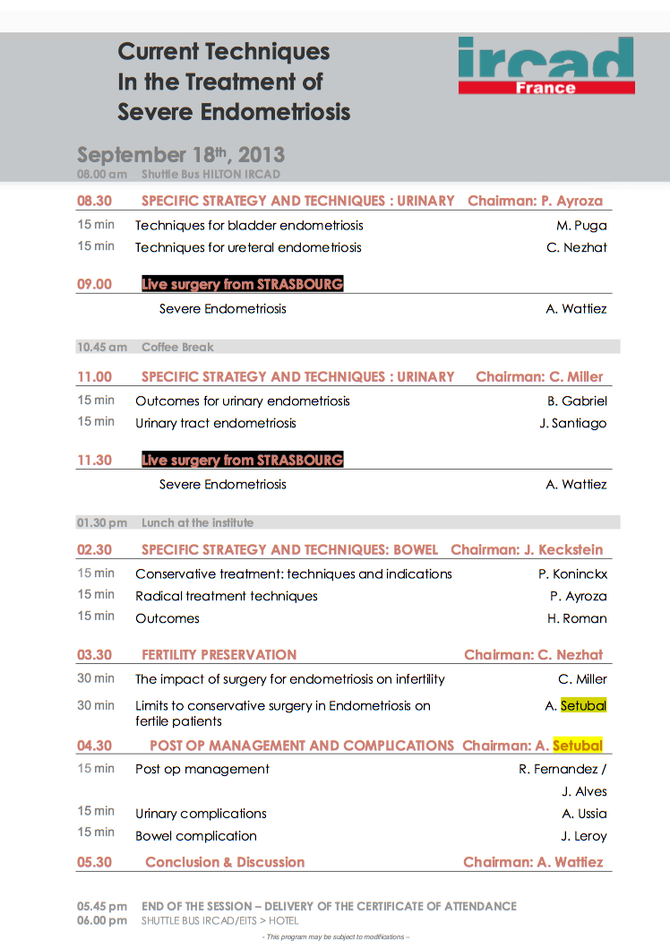 O Dr. Setubal irá estar presente nos próximos dias 16, 17 e 18 de Setembro na universidade de Estrasburgo. Durante a sua presença irá dar aulas teóricas e práticas sobre as mais recentes técnicas em tratamento de endometriose severo.
