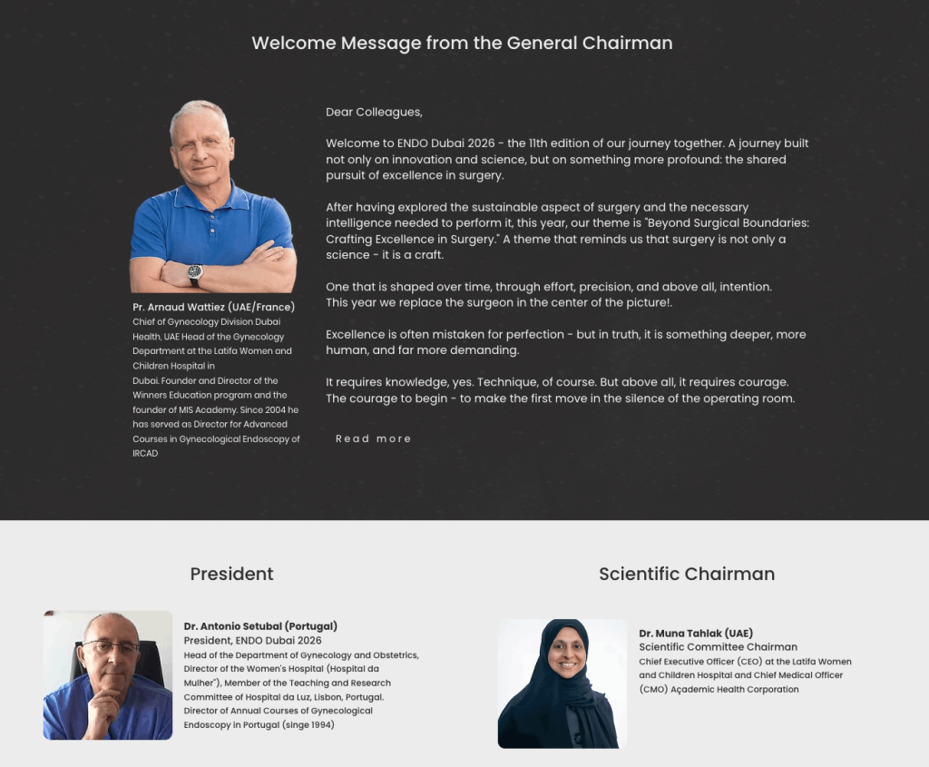 O ENDO Dubai – 11.ª Edição, acreditado pela Dubai Health Authority, é um dos congressos internacionais de referência em Cirurgia Minimamente Invasiva. Realizado no coração do Médio Oriente, reúne especialistas de todo o mundo para partilha de conhecimento, inovação e excelência científica.O Presidente da 11.ª Edição será o Dr. António Setúbal.